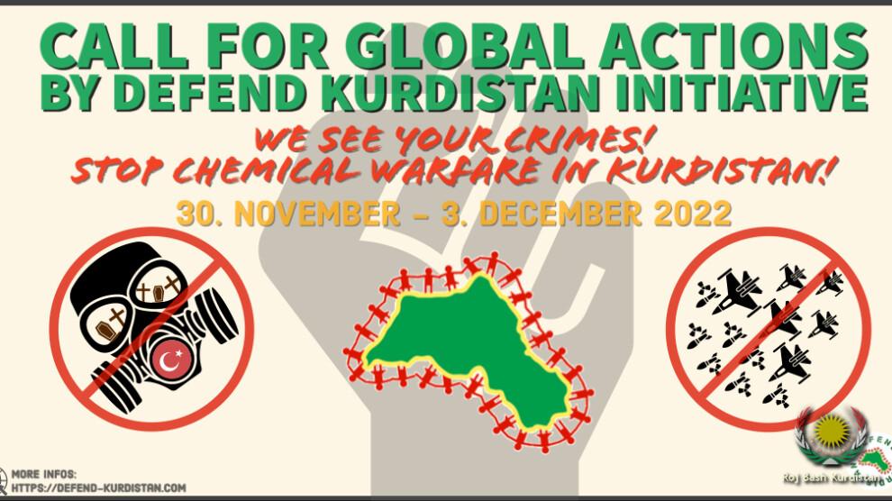 In a call, Defend Kurdistan said: "Starting on the UN Day of Remembrance for all Victims of Chemical Warfare, we call on you to use your creativity and solidarity from 30 November until 3 December to take action (for example, through occupations, street theatre, flash mobs, stadium actions, public film screenings, etc.) and participate together in the demonstrations on 3 December in your regions."